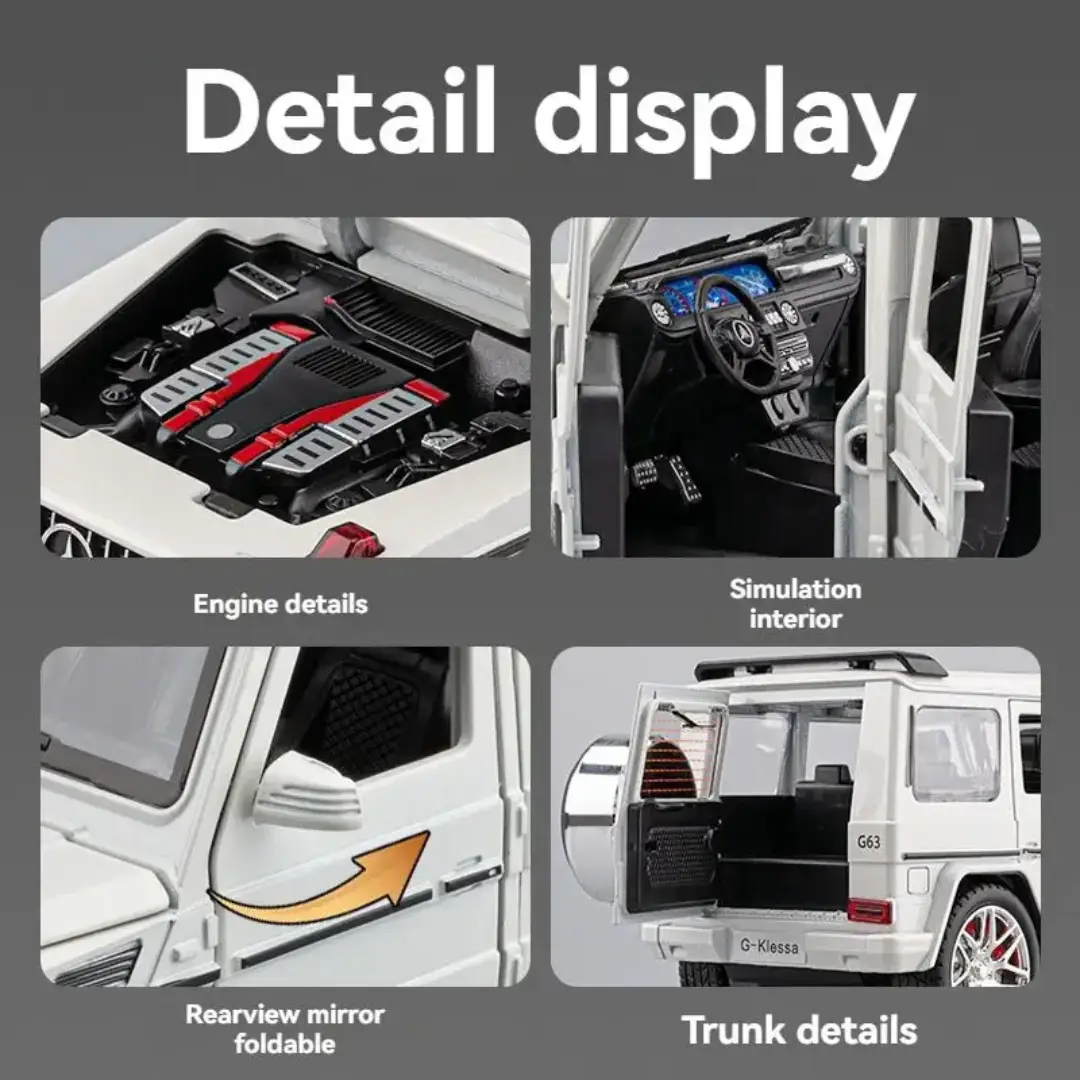 🚗 Realistic G63 AMG Design – 1:24 scale model inspired by the luxury Beenz G63 AMG, featuring detailed body structure, sporty look, and premium finish for a realistic appearance.